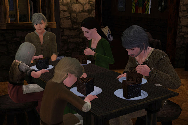 The party gathered at the table, with some extra stools placed nearby, for everyone to sit merry and indulge in the delicious birthday delicacy. They all shared some laughs and Byrhtnoth wasn't shy to tell some mildly embarassing stories from Linyeve's childhood to which she loudly scolded her father for announcing them.